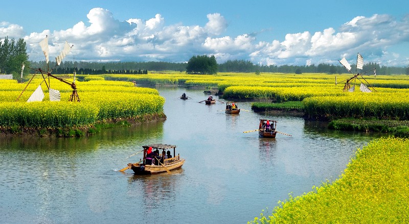 垛田是一代代兴化先民手挖肩挑、堆垒而成的智慧结晶,是利用自然、改造自然的壮举,更孕育出“垒土成垛、择高向上”的兴化精神。正因为有了这种不服输、向上攀,积小胜、为大胜的精神,才有了影片中名扬四海、享誉世界的千垛花海。影片中塑造了青春靓丽又机智敢为的“女村支书”叶梦虹,她有冲劲,学习能力强,敢于破旧立新。因地制宜,因时制宜,把垛田变成旅游景区,实现产业转换,带领乡亲走出特色农业发展路线,实现共同富裕。如今,千垛景区油菜花海已经与普罗旺斯熏衣草园、荷兰郁金香花海、京都樱花并称全球四大花海。这里河港纵横,菱藕飘香,块块隔垛宛如漂浮于水面岛屿,有“万岛之国”的美誉。